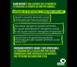 Non avendo ricevuto risposte in merito alle precedenti richieste sulla filiera produttiva dei mangimi (che includono abbondanti prodotti a base di carne e pesce) ben visibili sui loro siti di vendita on-line, la Fondazione Una ha deciso di interpellare pubblicamente i due soggetti, ponendo specifiche domande per ottenere chiarezza e trasparenza sul loro modello di business: