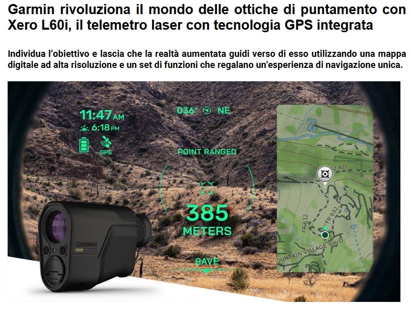 La ricerca di Garmin nello sviluppo di dispositivi concepiti per rendere veramente unica ogni esperienza outdoor non si ferma mai. Oggi, il know-how nella produzione di dispositivi di orientamento e di componenti ottici porta questa esperienza a un livello superiore: Garmin presenta la telemetria laser per esplorare nuovi orizzonti con Xero® L60i, il monocolo di puntamento con ricevitore satellitare integrato che unisce ottiche di alta qualità a sensori di ultima generazione per un nuovo modo di vivere le attività all’aria aperta. Xero L60i garantisce una conoscenza completa del territorio circostante attraverso una nuova esperienza di realtà aumentata, una sovrapposizione grafica a colori dei dati rilevati dai sensori e dei dati precaricati, tra cui le distanze, le mappe, i profili altimetrici e altro ancora.