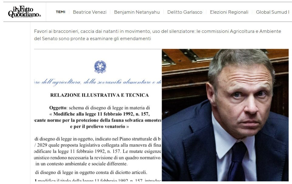 Il Presidente Maffei scrive al “Il Fatto Quotidiano” dopo l’articolo uscito domenica 28 settembre sulla riforma della l.n.articolo,  157/92