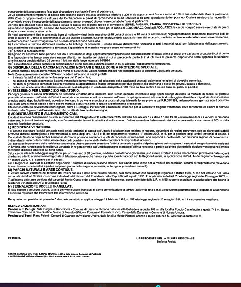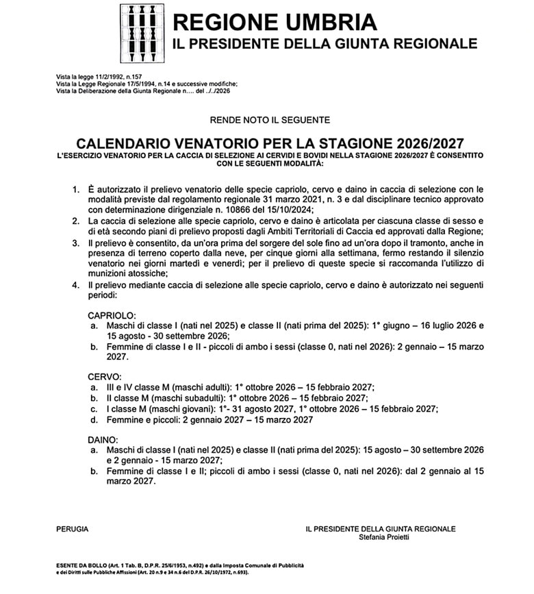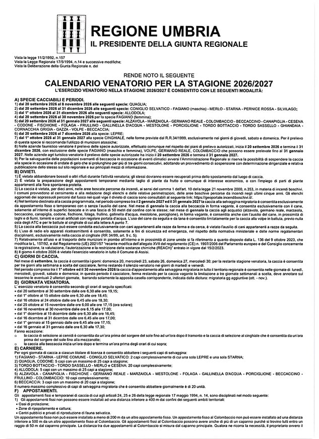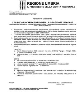 La Regione Umbria ha reso noto il nuovo calendario venatorio per la prossima stagione – si parte il 20 settembre per concludere (vedi specie consentite) al 31 gennaio 27